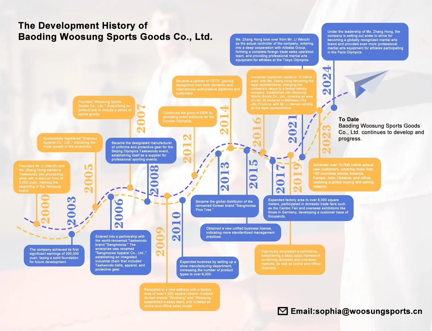 Pada tahun 2016, barang -barang olahraga Woosung meningkatkan modal terdaftar menjadi 10 juta yuan, dengan Ms Zhang Hong menjabat sebagai perwakilan hukum, mentransisikan perusahaan menjadi entitas tanggung jawab terbatas. Pada 2017, perusahaan memperluas area pabriknya menjadi lebih dari 8.000 meter persegi, berpartisipasi dalam berbagai pameran perdagangan domestik dan internasional seperti Canton Fair di Cina dan pameran dagang di Jerman, mengembangkan hubungan dengan lebih dari seribu klien.